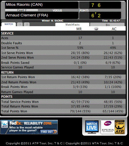 Raonic was up an early break in the first set, but Clement was able to get back on serve and take the set to a tiebreak. It was a close one, but Milos was able to edge Clement out and win the breaker. The second set was all Raonic. He didn't face a break point during the second, and he brought his ace total up to 17 for the match.